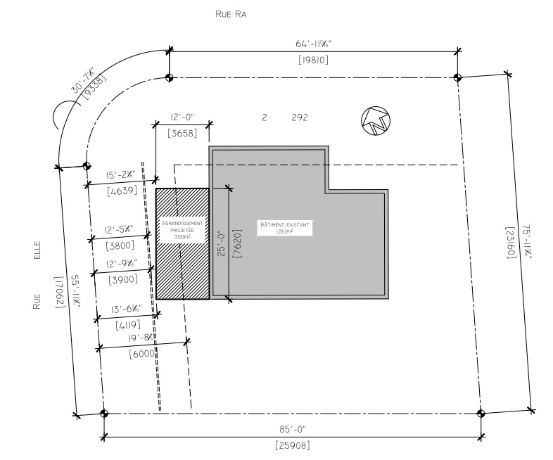 Schéma montrant la localisation et les dimensions des constructions par rapport aux éléments existants sur le terrain.